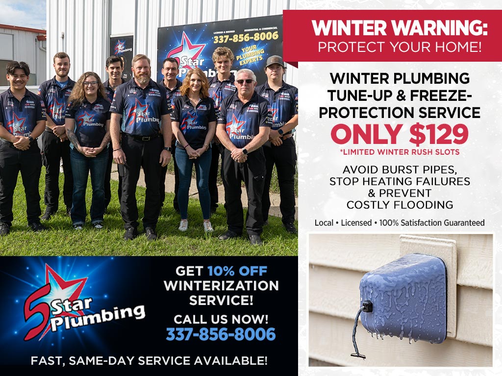 Since 2005, 5 Star Plumbing has been proudly serving Lafayette with top-notch local plumbing solutions. We believe in delivering not just plumbing services but peace of mind, reliability, and dedication to excellence. With our professional team and a reputation for five-star service, we're here to keep your plumbing systems running smoothly.